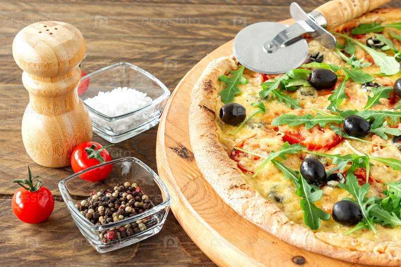 Приготовленный горячий пирог с пиццей с пепперони, помидорами, маслинами, рукколой и моцареллой на деревянной доске