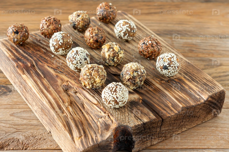 Здоровые сырые энергетические шарики. Конфеты веганские шарики фиников, мякоть кокоса, орехи на деревянном столе. Концепция полезных домашних леденцов без сахара