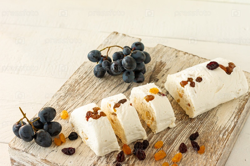 Нарезанная халва с орехами и сухофруктами на тарелке с цветами и фруктами на белом столе