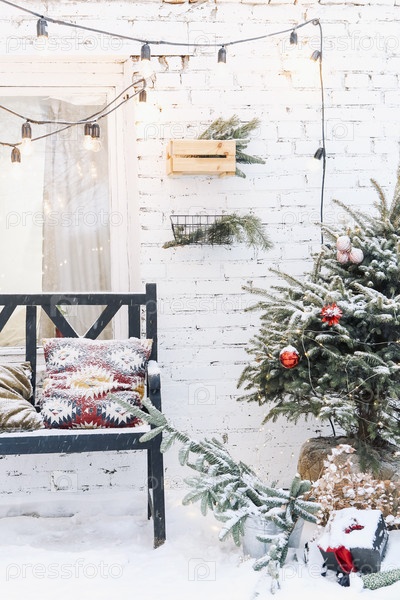 Домашнее крыльцо, украшенное заснеженными ветками елки