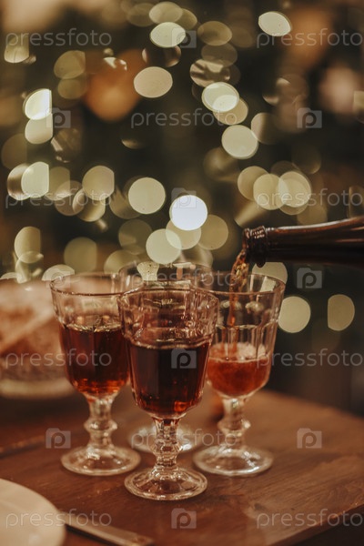 Празднование Нового года. Мужчина наливает шампанское в бокалы, стоящие на столе с праздничным рождественским ужином