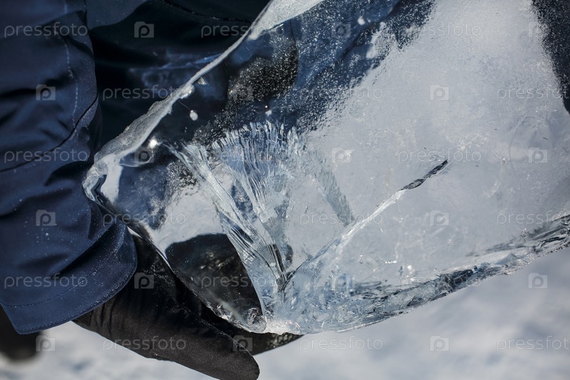 Счастливый улыбающийся мужчина в зимней синей куртке и с кусочком прозрачного дробленого льда в руках