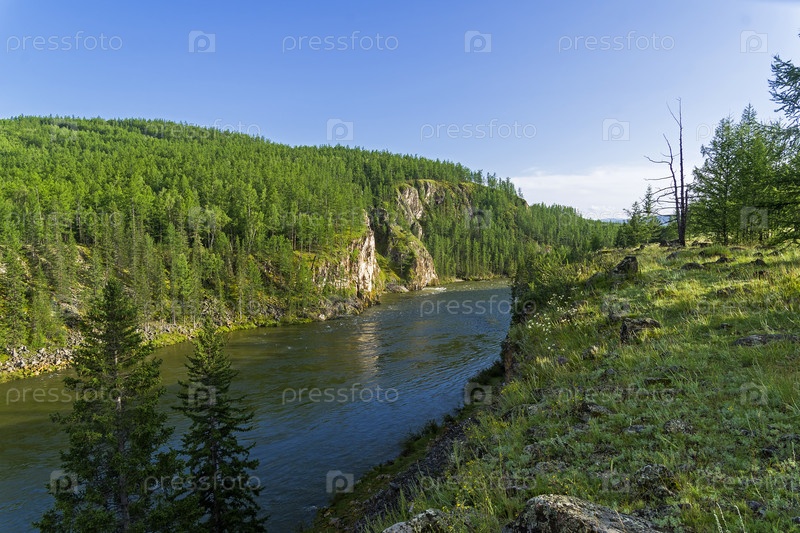 Вид на реку Ока Саянская с высокого обрывистого берега. Восточный Саян, Бурятия, Сибирь, Россия
