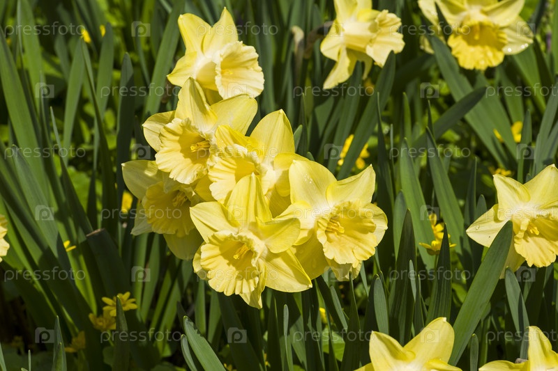 Красивые желтые нарциссы на клумбе. Аптекарский Огород (филиал ботанического сада МГУ), Москва