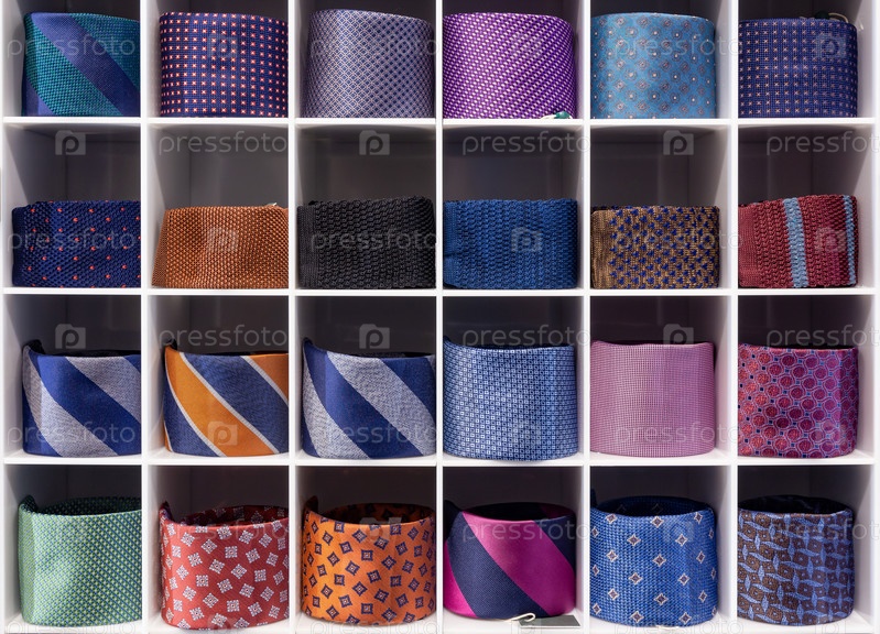 Витрина с разноцветными галстуками. Вид галстуков разных цветов в витрине. Витрина свернутых галстуков в магазине. Спиральные связи на полке в магазине. Перекрученные галстуки красиво уложены в ячейки