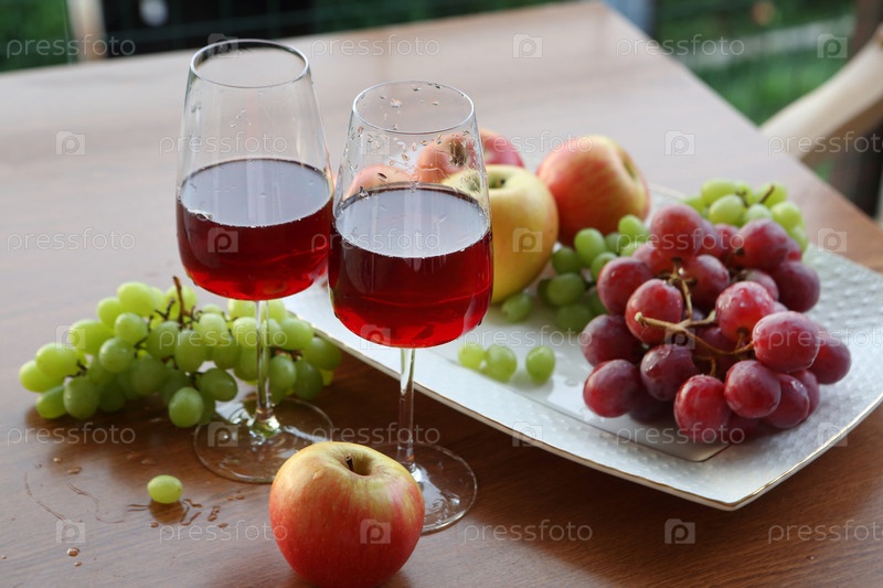Красное вино с фруктами на деревянном столе