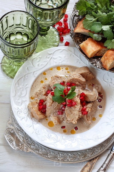 Сациви из курицы на белом деревянном фоне с зернами граната