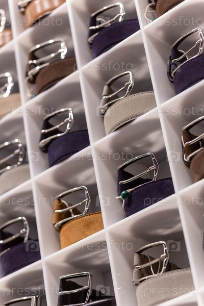 Различные кожаные ремни на полке в магазине в бутике мужской одежды. Небольшая глубина резкости. Концепция моды и одежды