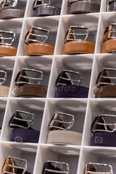 Различные кожаные ремни на полке в магазине в бутике мужской одежды. Небольшая глубина резкости. Концепция моды и одежды
