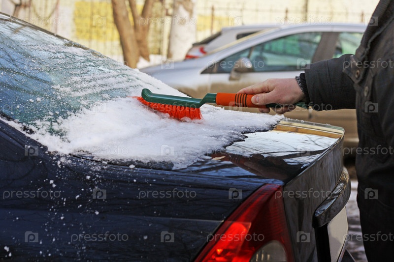 Мужская щетка чистит машину от снега
