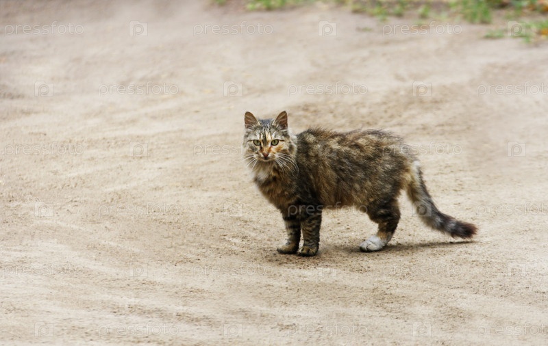 Коричневый пушистый кот стоит на песчаной пустой дороге