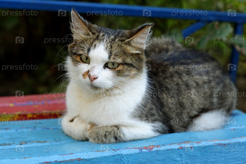 Пушистый большой кот на скамейке