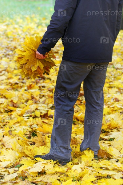 Осень. Мужчина стоит спиной и держит осенний букет, собранный из желтых кленовых листьев
