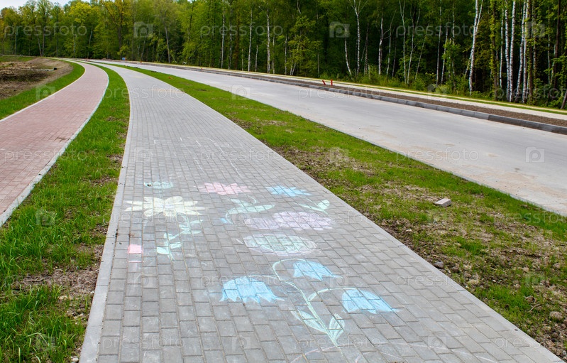 Новый современный плиточный тротуар с нарисованными мелом цветами возле строящейся дороги