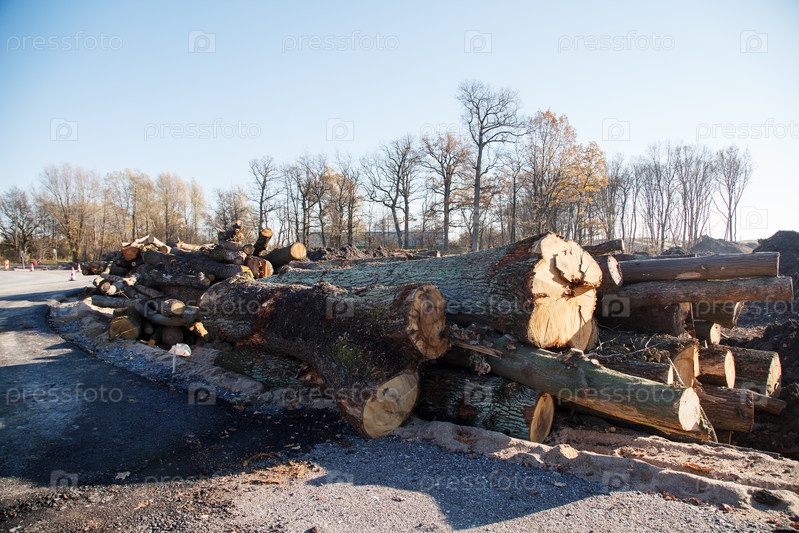 Куча деревьев спилена и подготовлена к вывозу. на открытом воздухе в осенний день