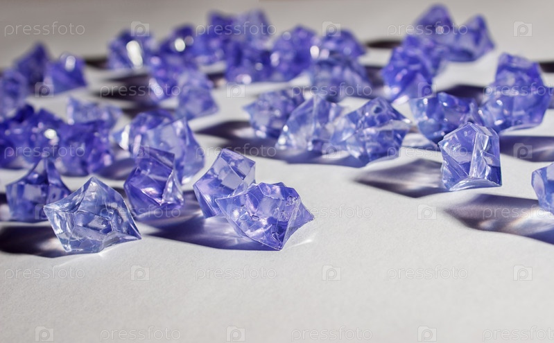 Кристаллы синего стекла на столе в помещении крупным планом