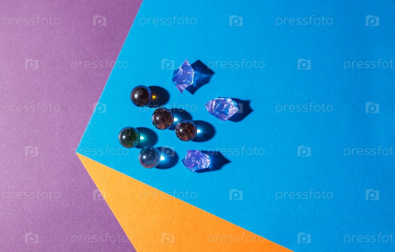 Разноцветные стеклянные шарики и голубые кристаллы на столе в помещении крупным планом