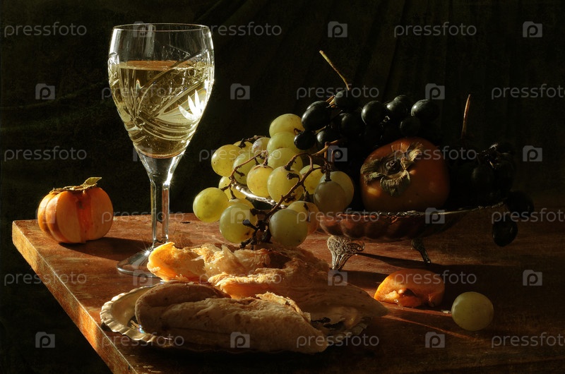 Белое вино с хурмой, виноградом и хачапури на деревянном столе