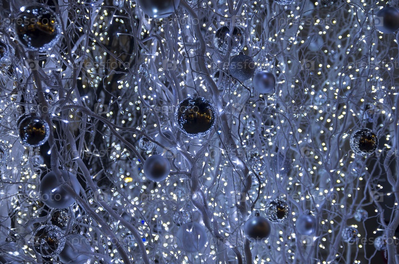 Красивые новогодние украшения из стеклянных шаров и электрических гирлянд как фон