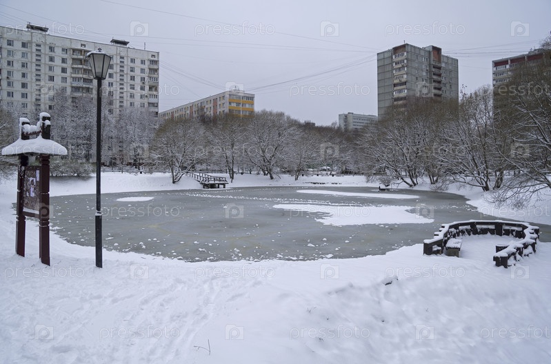 Недавно замерзший городской пруд. Троицкий пруд, Коньково, Москва, Россия. Предзимье. Конец ноября