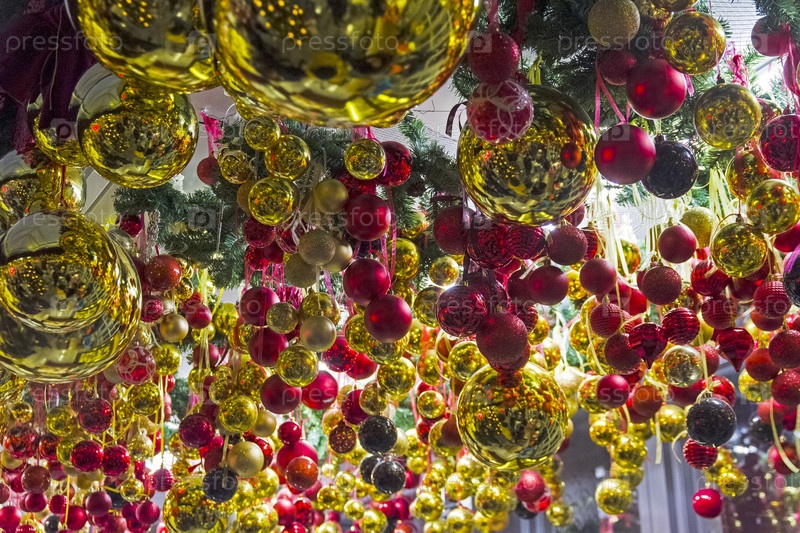 Новогоднее украшение интерьера - разноцветные стеклянные шарики, висящие под потолком