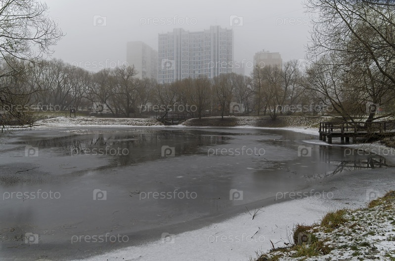 Хмурая осень. Троицкий пруд, покрытый первым льдом. Юго-Западный округ Москвы, улица академика Арцимовича. Пасмурно, туман, конец ноября