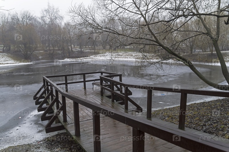 Хмурая осень. Троицкий пруд, покрытый первым льдом. Юго-Западный округ Москвы, улица академика Арцимовича. Пасмурно, туман, конец ноября