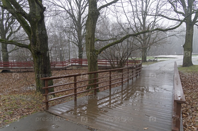 Хмурая осень. Лужи на деревянном настиле пешеходной дорожки в лесопарке. Пасмурно, туман, конец ноября. Теплостановский лесопарк, Москва, Россия