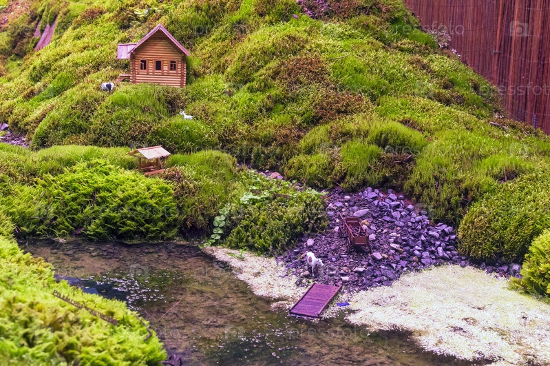 Моделирование сельского пейзажа путем установки деревянных моделей сельских домов в ланшафте, созданном из разноцветных мхов