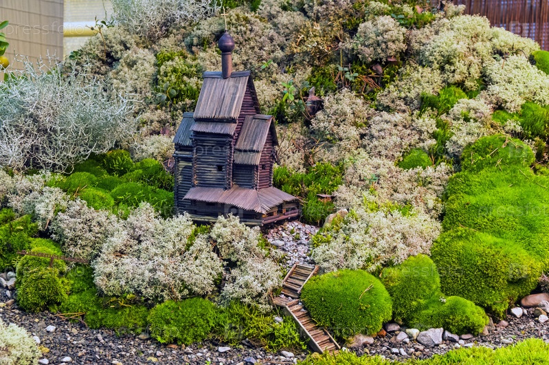 Моделирование сельского пейзажа путем установки деревянной модели сельской рубленой церкви в ланшафте, созданном из разноцветных мхов