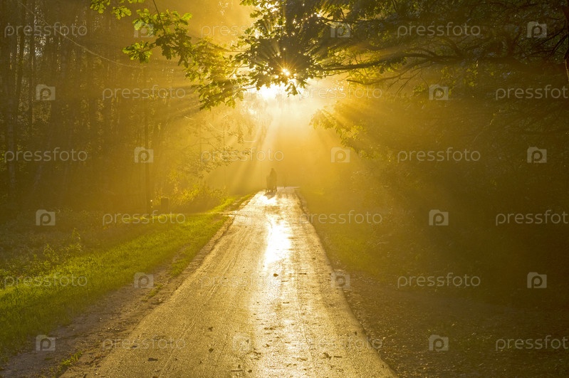 Солнечные лучи пробиваются сквозь туман. Ранний вечер. Москва, Теплостановский лесопарк