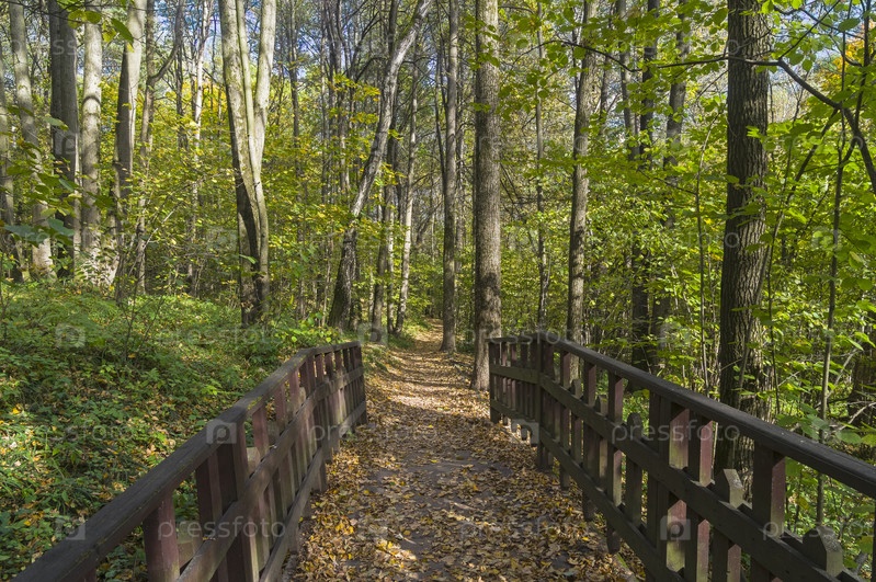 Благоустроенная дорожка в лесопарке, идущая по склону оврага. Солнечный день в начале октября. Москва, Битцевский парк, Узкое