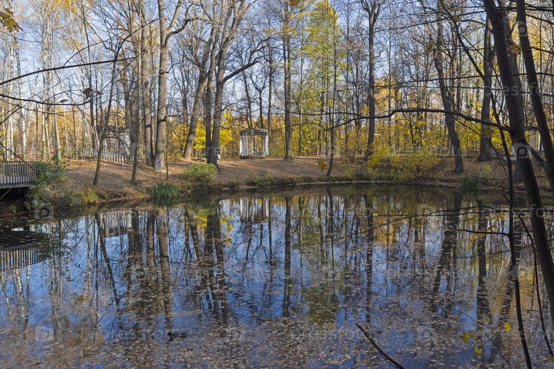 Пруд в осеннем лесопарке. Природный заказник на Воробьевых горах, Москва. Солнечный день в октябре