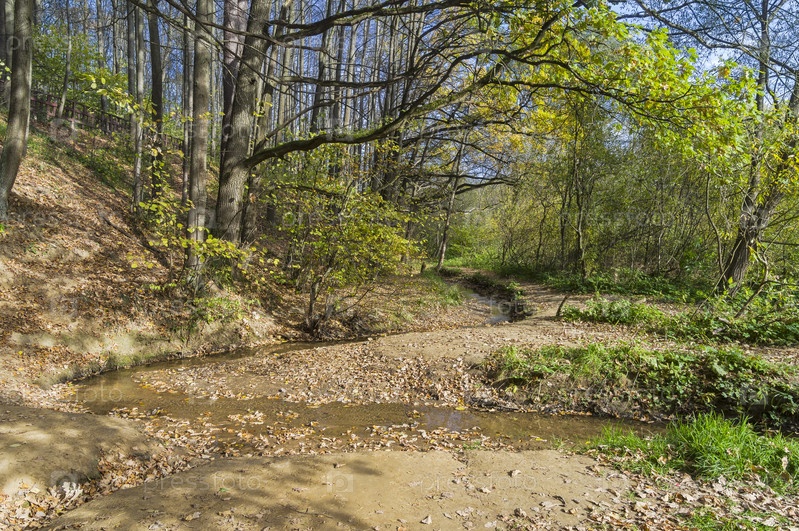Красивый осенний пейзаж - верховья реки Чертановка. Солнечный день в начале октября. Москва, Битцевский парк, Узкое