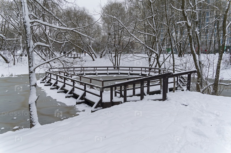 Недавно замерзший городской пруд. Троицкий пруд, Коньково, Москва, Россия. Предзимье. Конец ноября