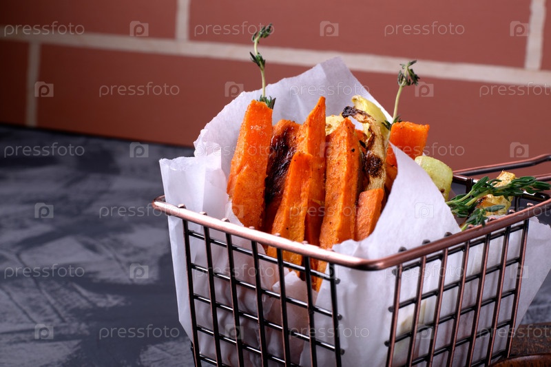 Запеченный сладкий картофель и палочки из цуккини с тимьяном и специями подаются в проволочной корзине на деревянной доске. Здоровая закуска и альтернатива фаст-фуду