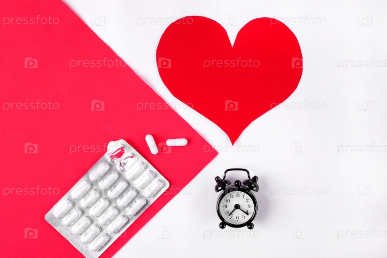 Капсулы в блистерной упаковке, будильник и бумажное сердце на красном и белом. Медикаментозное лечение и профилактика сердечно-сосудистых заболеваний. Медицинская и фармацевтическая плоская планировка