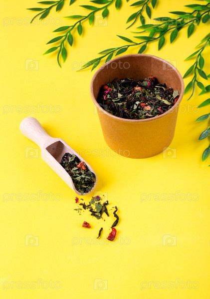Чай из кипрея или Иван Чай с листьями смородины и ягодами, яблоком, шиповником и лепестками роз в бумажной чашке с деревянным совком на желтом фоне