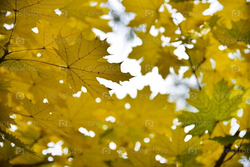 Желто-зеленые красивые и большие кленовые листья на фоне белого неба. Красивый фон из листьев и неба в течение дня