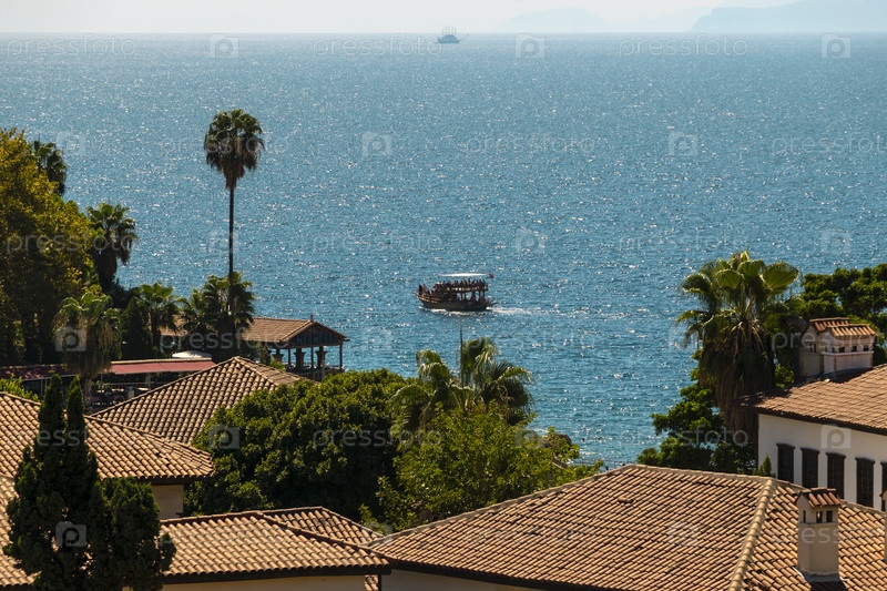 Крыши средиземноморского городка на фоне синего моря и гор вдалеке. Концепция отдыха на море летом