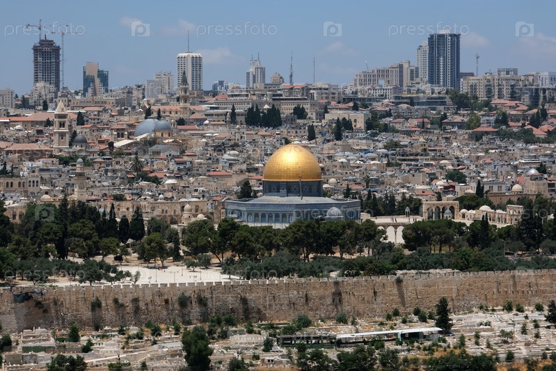 Вид на Иерусалим с Елеонской горы. В цетре золотой купол Куббат ас-Сахра