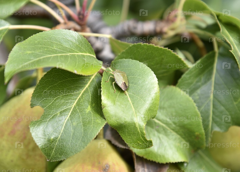 Зеленый садовый жук на зеленой листве в саду летом. Насекомое-вредитель в саду