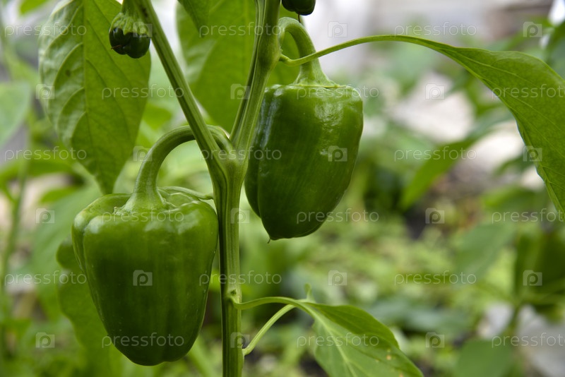 Сочный зеленый перец, растущий на кусте в теплице. Выращивание перца
