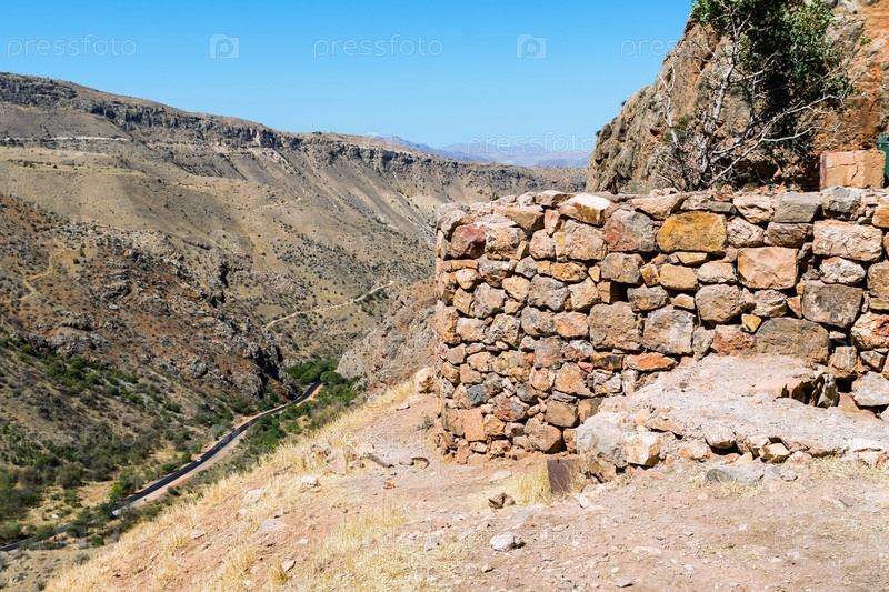 Древняя каменная стена и вид на горное ущелье в Армении