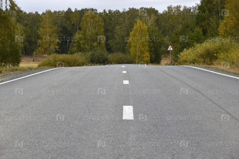 Осенью скоростная асфальтированная дорога и красивый лес с полем. Шоссе в осеннем лесу