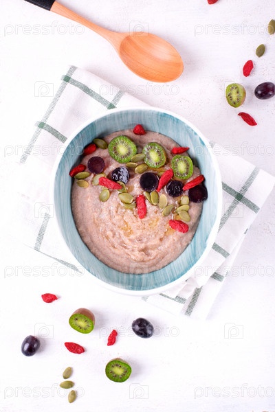 Сливочная каша фарро подается с мини-киви, виноградом, ягодами годжи и тыквенными семечками в миске. Молотые хлопья из полбы в качестве здорового завтрака. Вид сверху