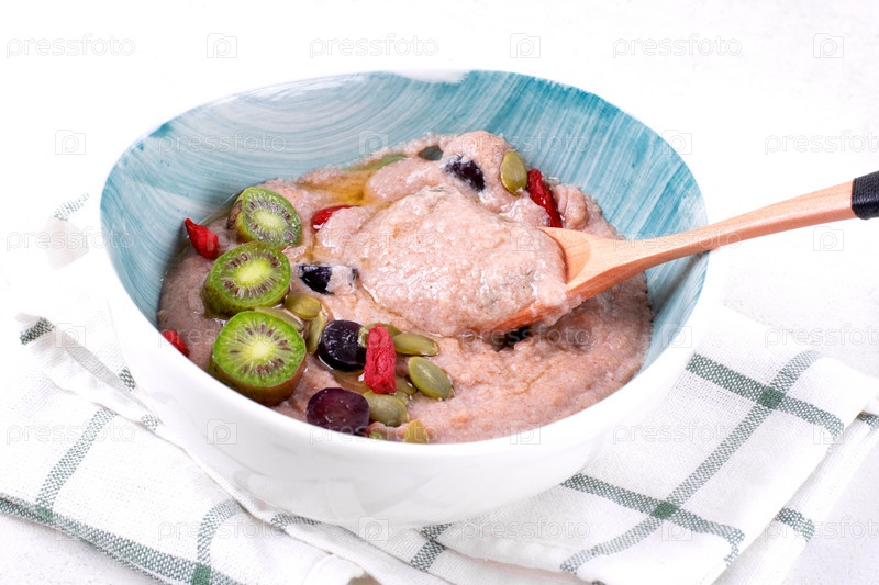 Сливочная каша фарро подается с мини-киви, виноградом, ягодами годжи и тыквенными семечками в миске. Зерновые хлопья из спельты как полезный завтрак