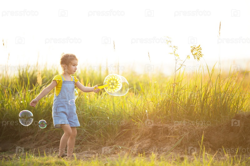Девушка в джинсовом комбинезоне пускает мыльные пузыри летом в поле на закате. Международный день защиты детей, счастливый ребенок, мероприятия на свежем воздухе. Летний фон. Здоровый и экологичный образ жизни