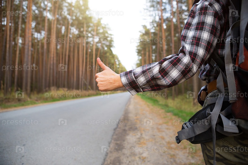 Рука с большим пальцем вверх на фоне шоссе - автостоп, голосование. Турист в клетчатой рубашке с рюкзаком возле леса едет автостопом. Автостоп, внутренний туризм, приключение в одиночку, путешествие, поход