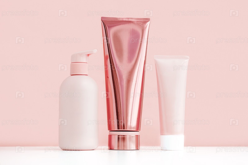 Смоделируйте розовую косметическую бутылку и тюбики. Минимальный монохромный состав средств по уходу за кожей